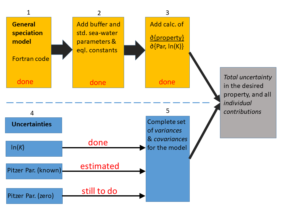 We are using a matrix method of uncertainty propagation essentially the same as that described in Appendix A of Orr et al. (ref. 1). In our case the vector of partial derivatives (their eq. A.2) consists of the differentials of the model-calculated quantity of interest (e.g., pH, one of the K* of the carbonate system) with respect to all individual Pitzer interaction parameters and thermodynamic equilibrium constants in the model. Many of these Pitzer parameters co-vary.